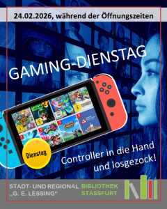 Unser nächster Gaming-Dienstag findet am 24.02.2026 während der Öffnungszeiten in der Bibliothek statt. Stellt euer Können unter Beweis und erlebt gemeinsam spannende Abenteuer! 🕹️