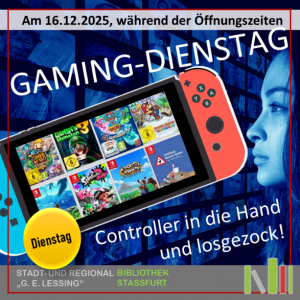 Unser nächster Gaming-Dienstag findet am 16.12.2025 während der Öffnungszeiten in der Bibliothek statt. Stellt euer Können unter Beweis und erlebt gemeinsam spannende Abenteuer! 🕹️